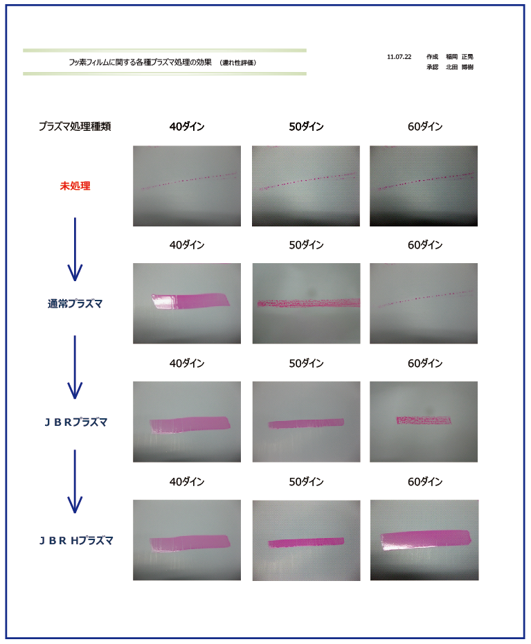 接触角でいうとだいたい40°ぐらいですのでそれ以上の計測は接触角に頼るしかないのです。プラズマ処理を使うとこの角度が著しく変化し、それらをもとに様々な試験が始まります。