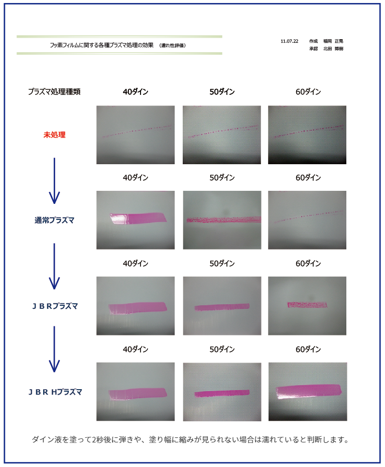 接触角でいうとだいたい40°ぐらいですのでそれ以上の計測は接触角に頼るしかないのです。プラズマ処理を使うとこの角度が著しく変化し、それらをもとに様々な試験が始まります。