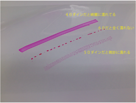 この画像に表記されているのは40ダインの試薬では綺麗に濡れるのに60ン試薬では弾いて玉状になっているのがわかります。その下50ン試薬では微妙に濡れているのがわかります。このように数ある試薬を試験塗りしてどれぐらいのレベルかを計っていきます。